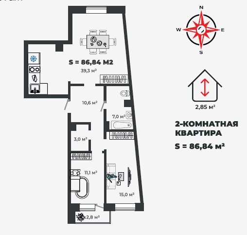 2-комнатная квартира 86,84кв.м. Чертыгашева 164