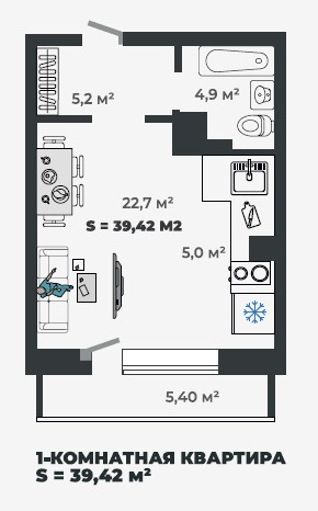 1-комнатная квартира 39,42кв.м. Чертыгашева 164