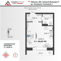 1-комнатная квартира 39,89кв.м. Генерала Тихонова 1