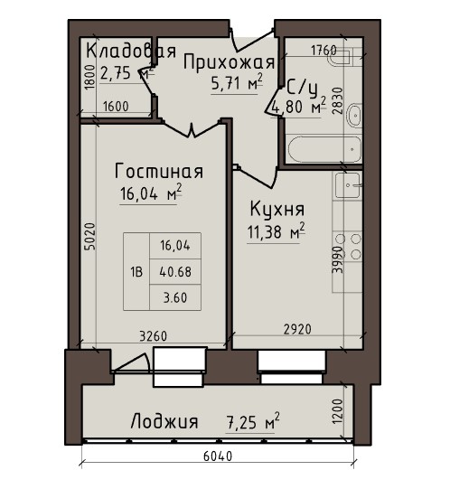 1-комнатная квартира 44,28кв.м. Авиаторов 5