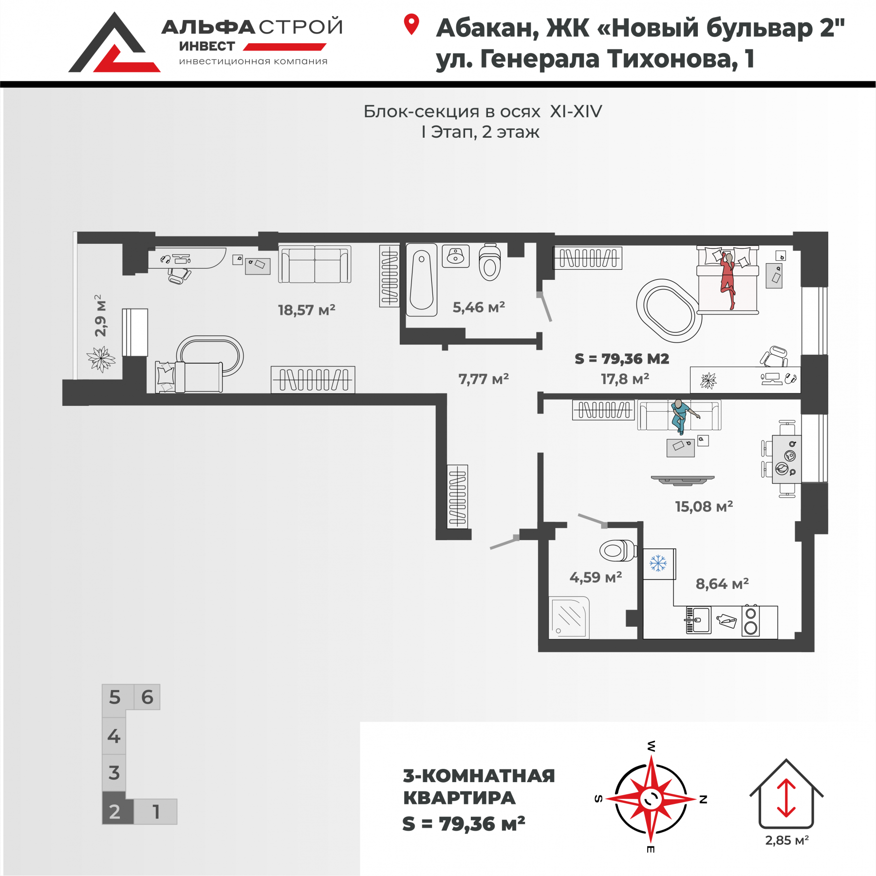 3-комнатная квартира 79,36кв.м. Генерала Тихонова 1